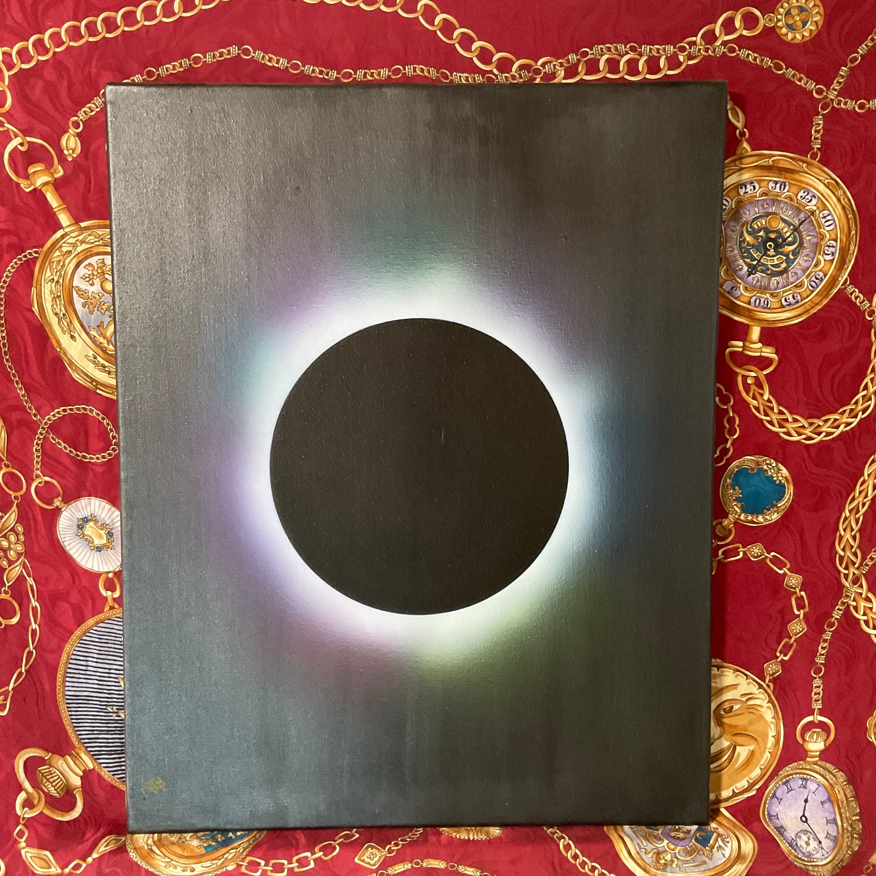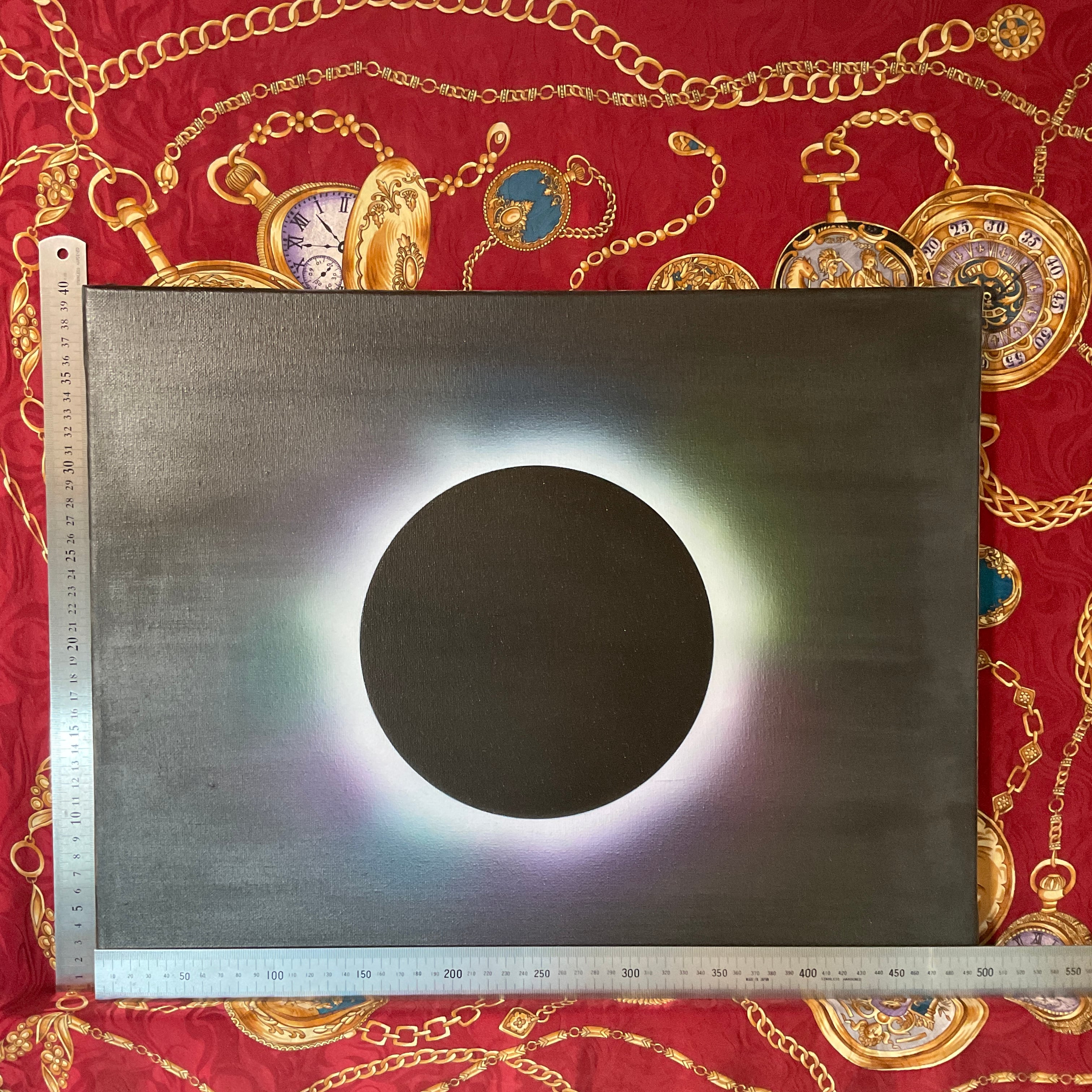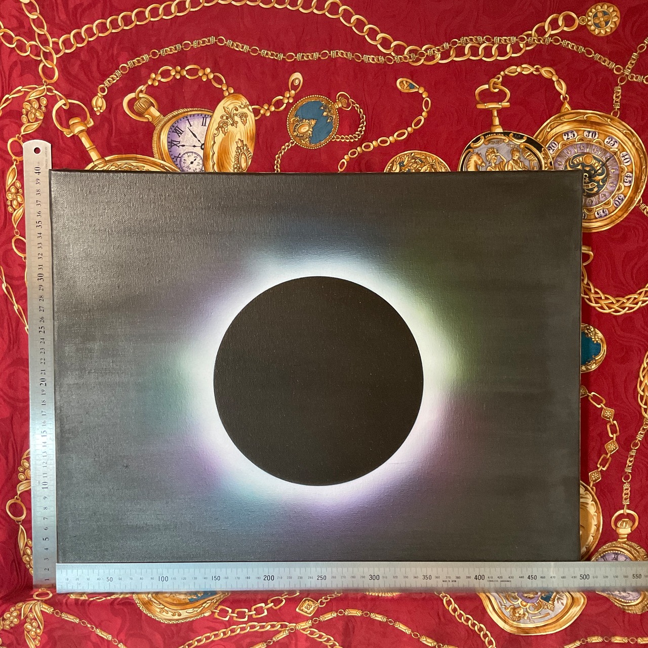 今回紹介するのは皆既日食と黒丸(ブラックホール天之御中主神)を彷彿させるアクリル画400x500mmキャンバスです。