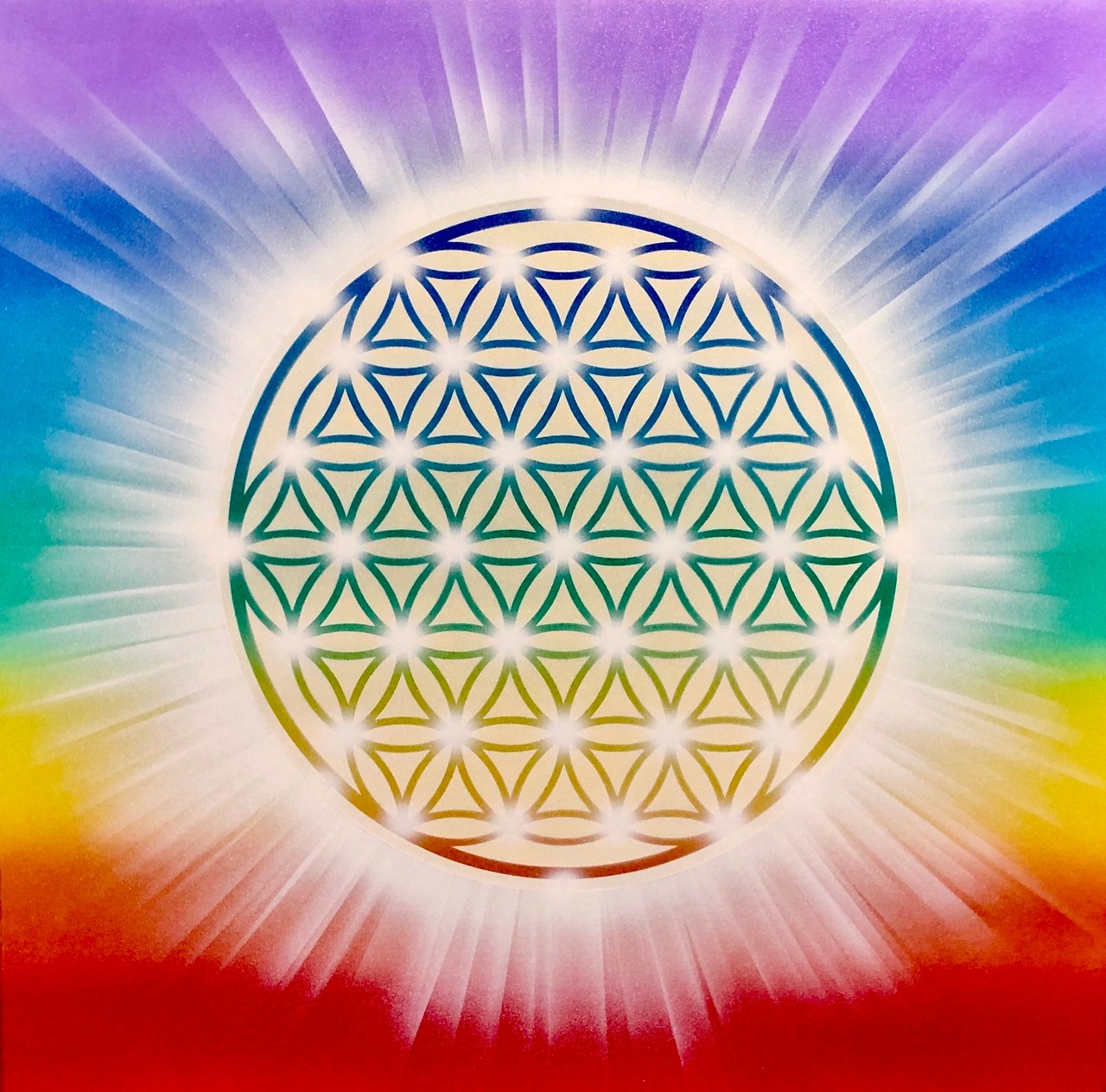 今回はバックをチャクラカラー、フラワーオブライフを白系のゴールドで仕上げました。チャクラや虹の色は奇跡の色とも言われています。絵画に強い光を当てると凄まじく輝くのでかなりのエネルギーを感じます。