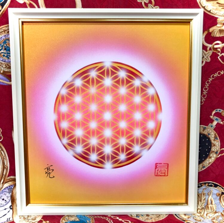 マンダラアートフラワーオブライフ神聖幾何学 風水開運絵画 色紙サイズ額縁付き
